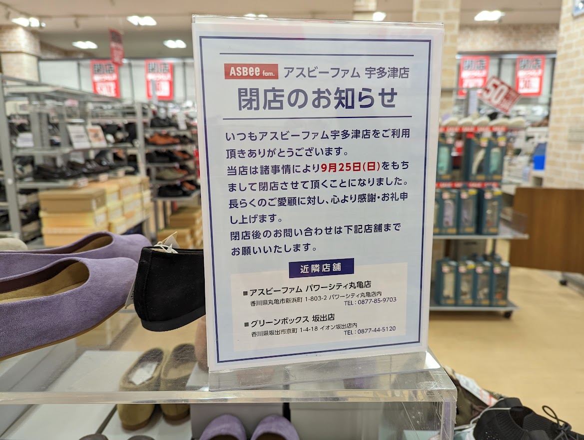 イオンタウン宇多津1階にある「ASBee fam(アスビーファム) 宇多津店」が2022年9月25日(日)に閉店するそうです。
