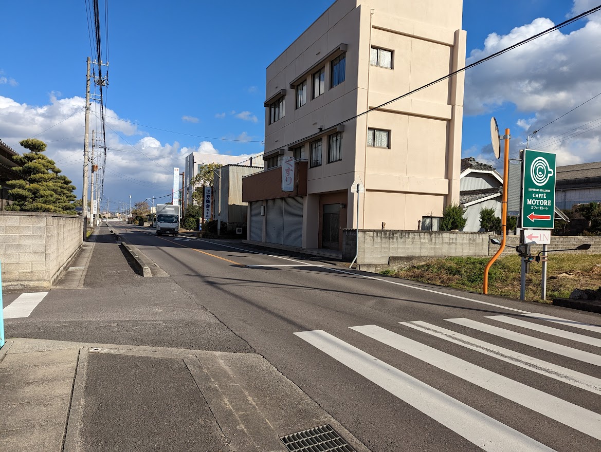菓匠もりん 善通寺本店のすぐ側の信号のある交差点から西へ向かっていると、左手に「CAFFÈ MOTORE」の看板とカーブミラーが見えてくるので、それを目印に右折すると右手に見えてきます。