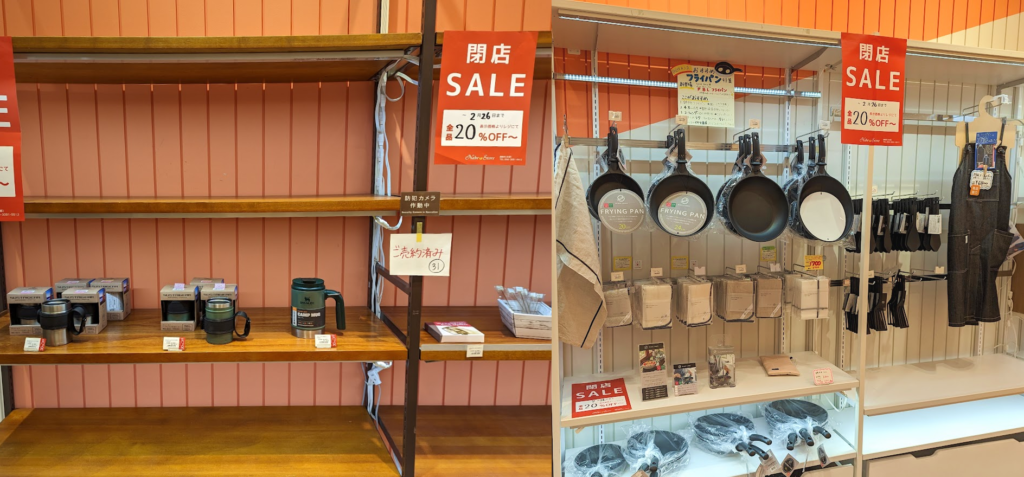 人気のアウトドア用品は残り僅かとなっていますが、まだ商品棚には数点残っていて、店内にある棚も販売され、殆どの棚に売約済みの札が張られていました。