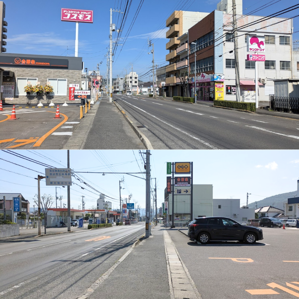 県道33号線のゲオ 坂出元町店 と同じ敷地内にあり、土日祝日関係なく人も車も比較的通りが多い場所になるので運転には注意しましょう。
