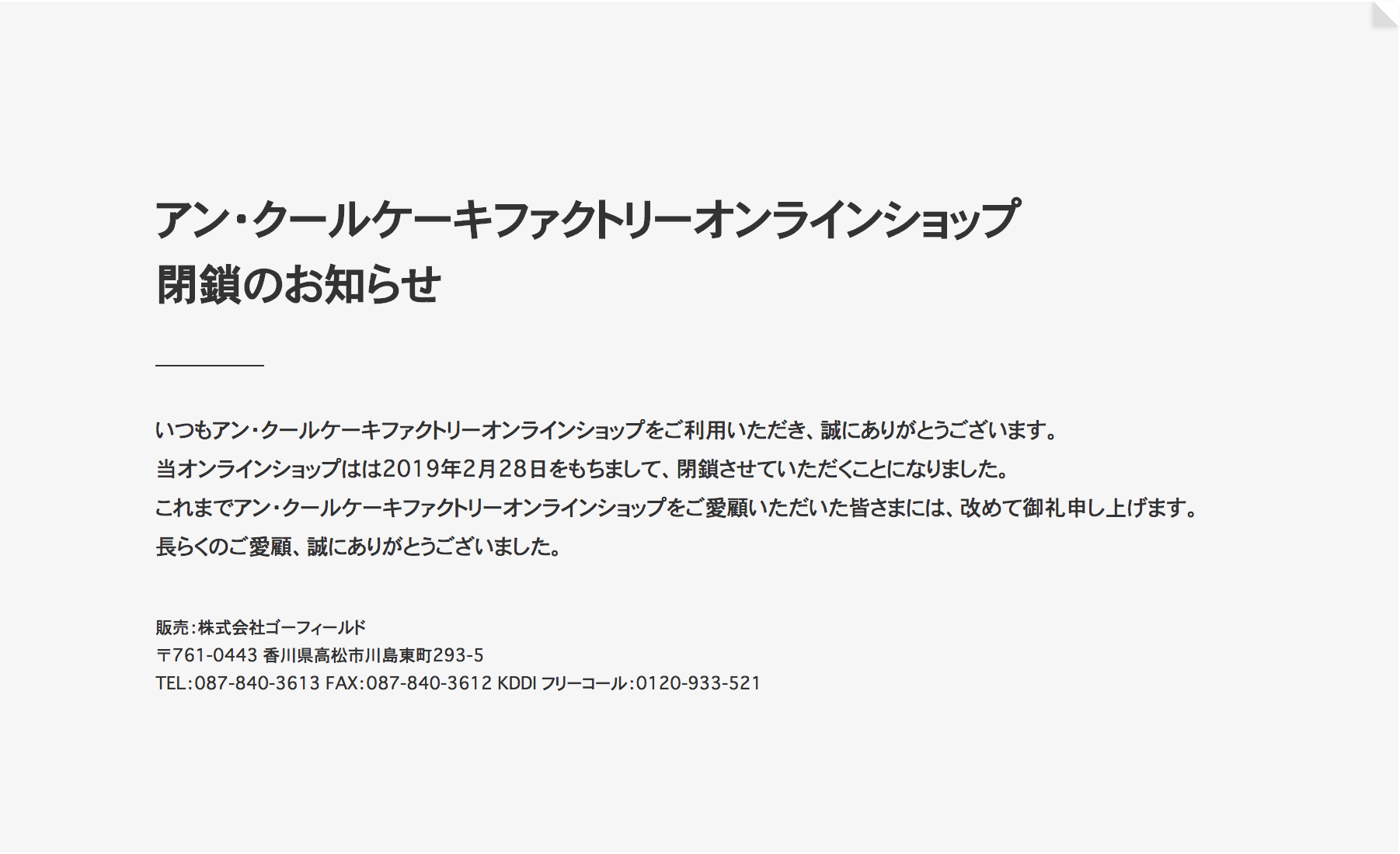 オンラインショップは2019年2月28日をもって閉鎖したとあります。店舗も2月末で閉店だったのでしょうか。