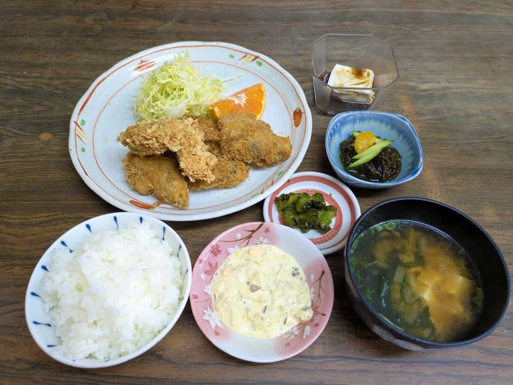 今シーズンは2025年3月辺りまで1日限定数で「牡蠣フライ定食」のみ提供されてるため売切れ次第終了です。今年も加工せず、仕入れた新鮮な宅間産牡蠣を毎日身をくりぬいて調理されていて、身がぷりっとジューシーで臭みやクセがないクリーミーな味わいが特徴です!筆者もここの牡蠣フライだけはこのボリュームでも余裕で完食できます(笑)