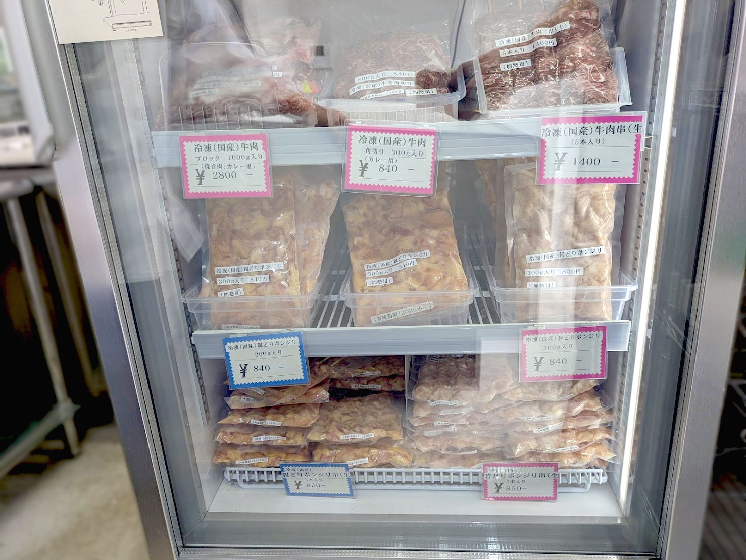 店内では、リクエストが多かった“生肉・生串”に加えて、冷凍の「親鶏ぼんじり」「若鶏ぼんじり」「国産牛肉」まで並ぶようになりました。