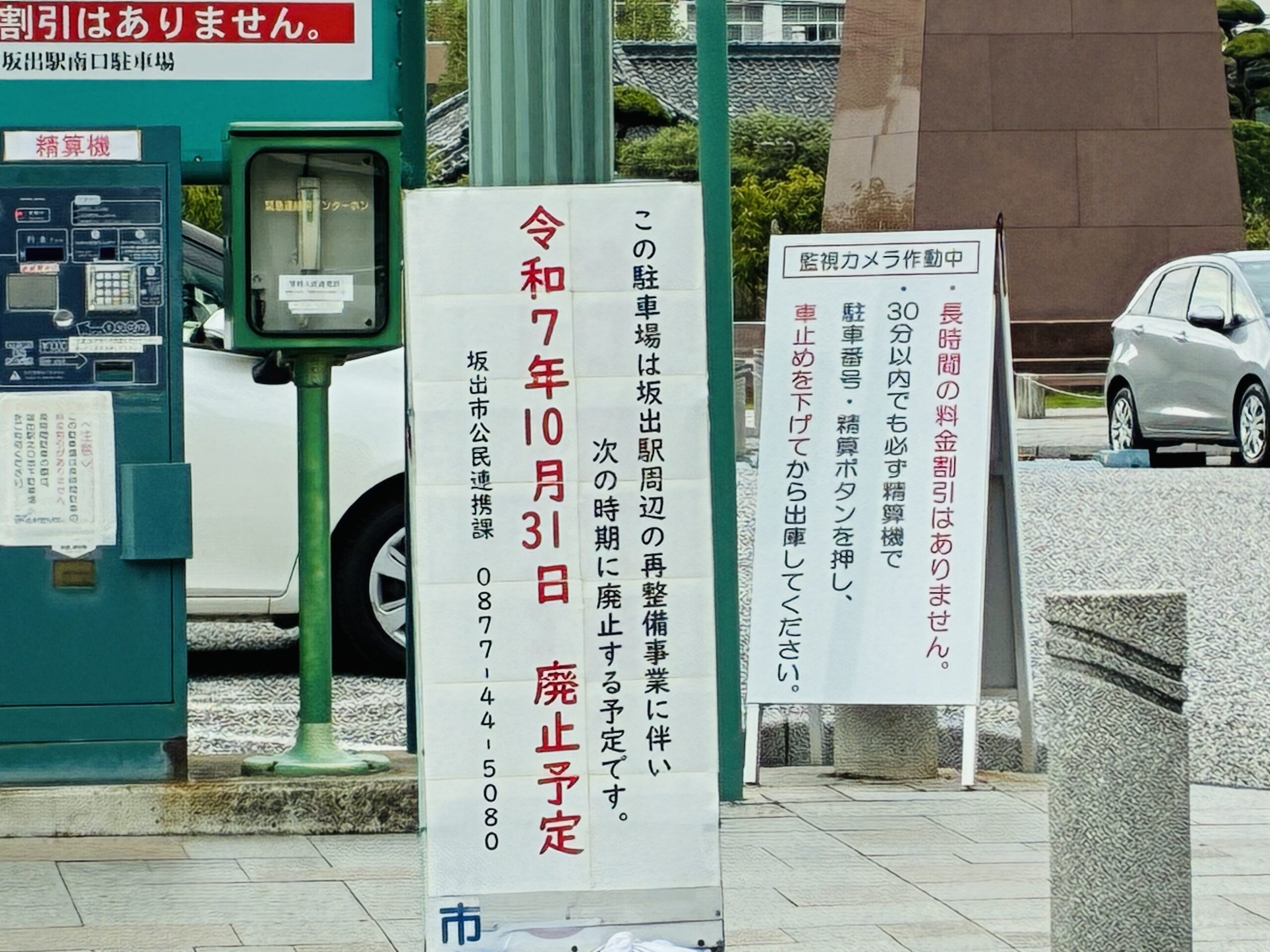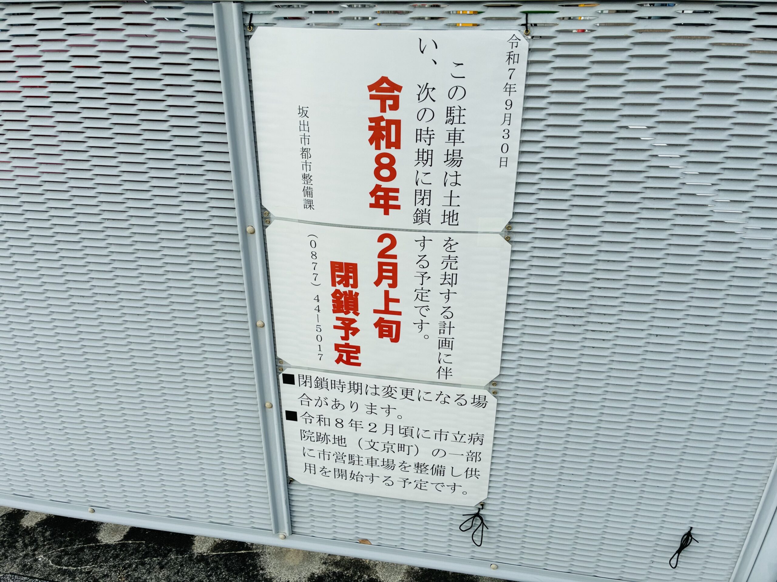 坂出市文京町の坂出駅南口駐車場が2025年10月31日(金)で閉鎖されるようです。