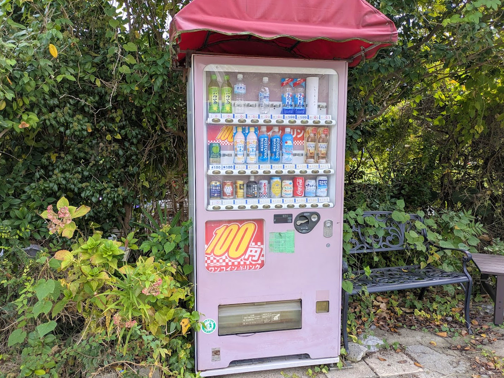 丸亀市本島をぶらぶら歩いていると、木々に隠れるようにポツンと現れる可愛らしい自動販売機を発見。