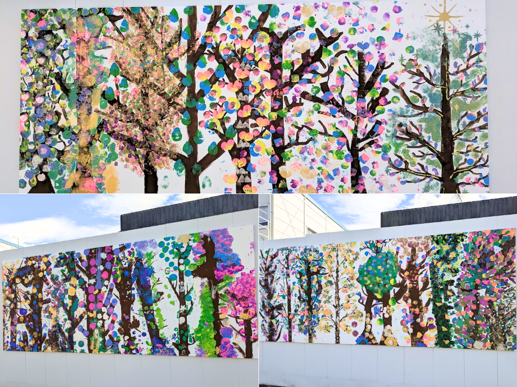 大きなシートいっぱいに、参加者のみなさんがカラフルな絵の具で思い思いの“木”を描き、その完成作品が11月中旬ごろに県道33号線沿いへ掲示されました!