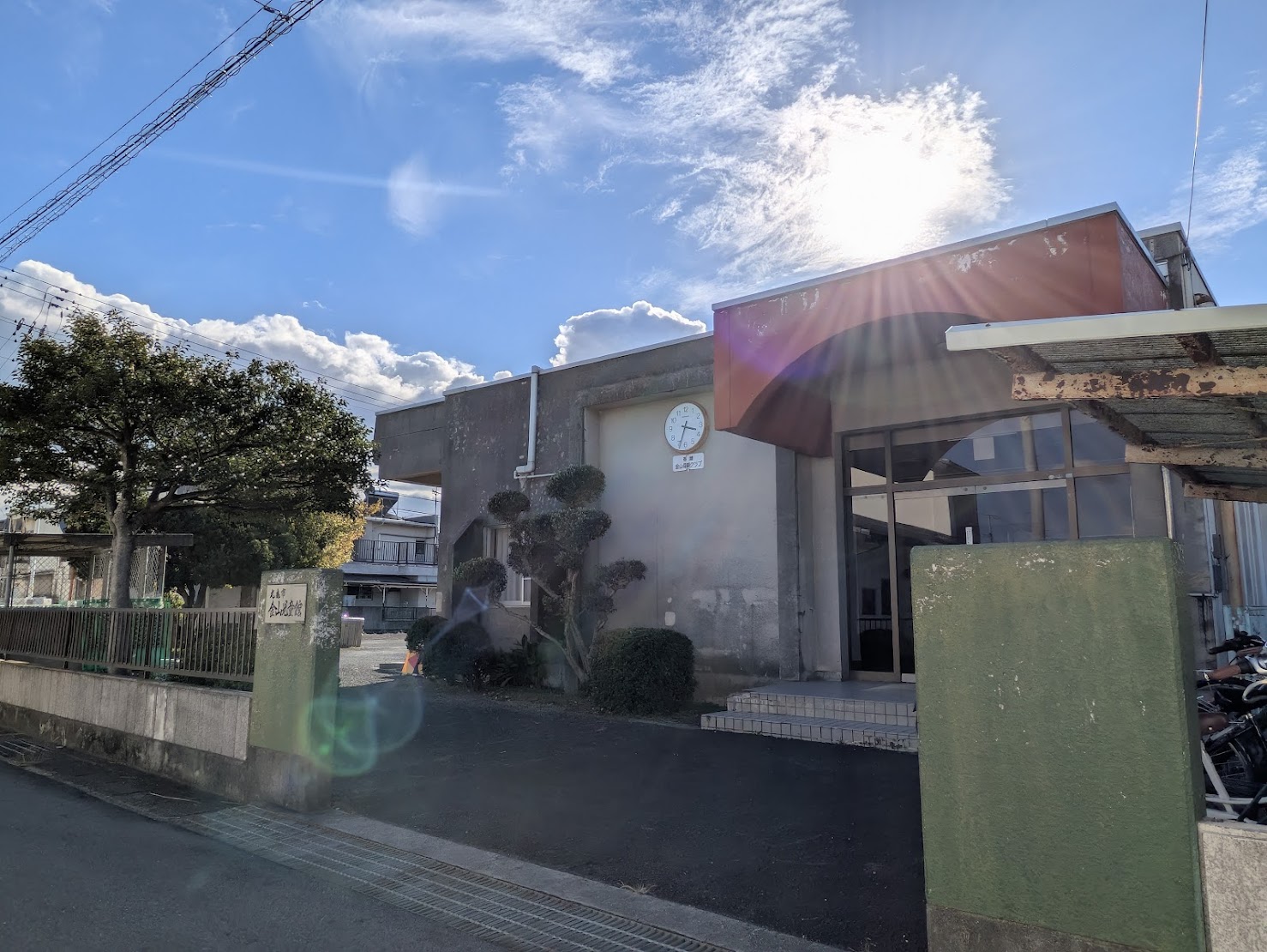 時計の付いた正面玄関や、昔ながらの庇など、レトロで親しみのある雰囲気。