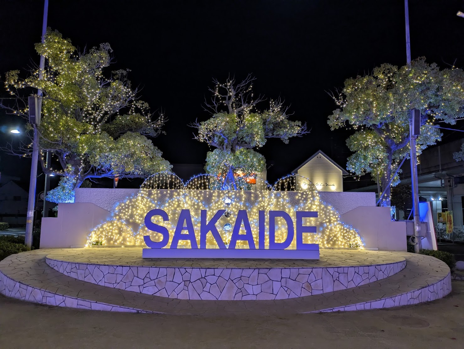 ステージ前には、ゴールドに輝くイルミネーションと一緒に「SAKAIDE」の大きなオブジェも設置。旅の思い出としても記念撮影にぴったりですね!