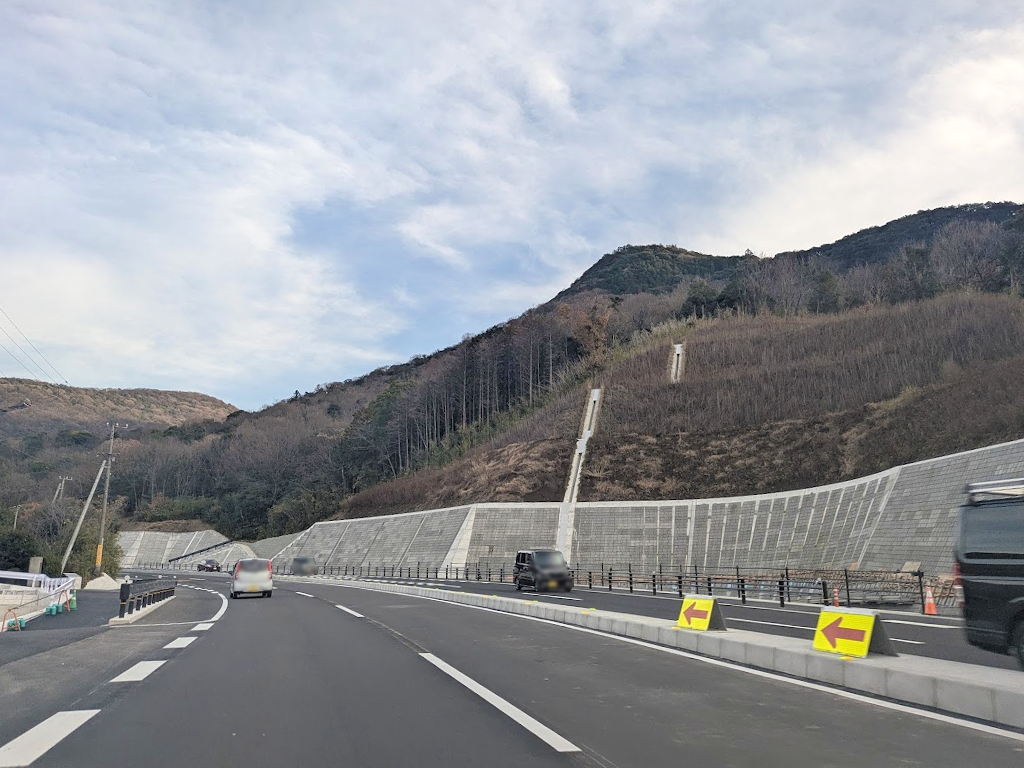 4車線化による中央分離帯の設置に伴い、坂出方面に向かう途中で、今までできていた「右折」ができなくなっている箇所がありましたので、その辺りも注意が必要です。
