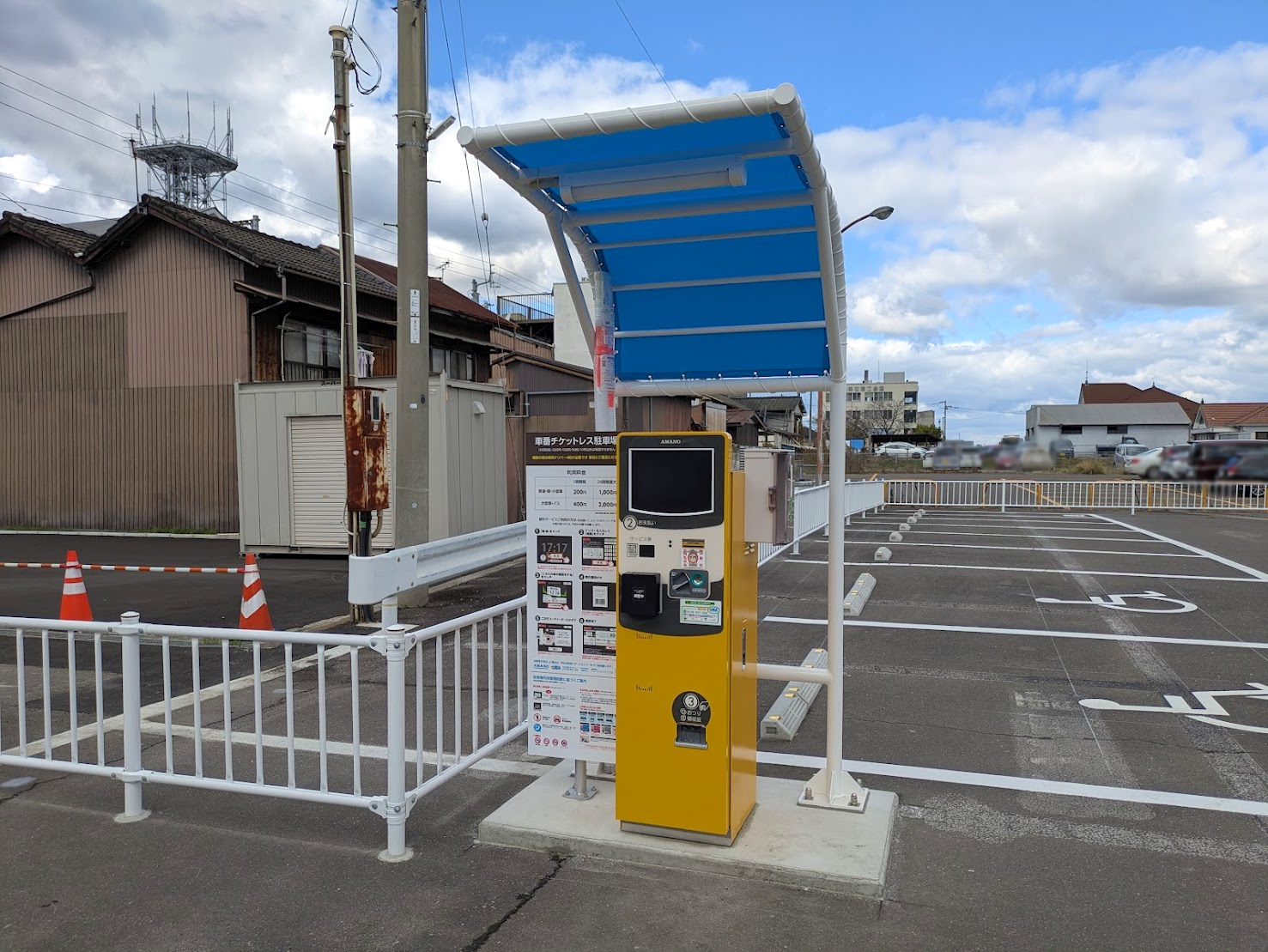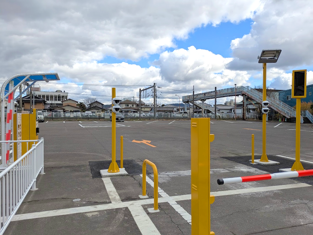 今回のリニューアル最大の注目ポイントは、「ナンバー認識システム」の導入です!入り口には黄色いポールとカメラが数台設置されていますね。最近増えている「チケットレス」タイプの駐車場になったようです。