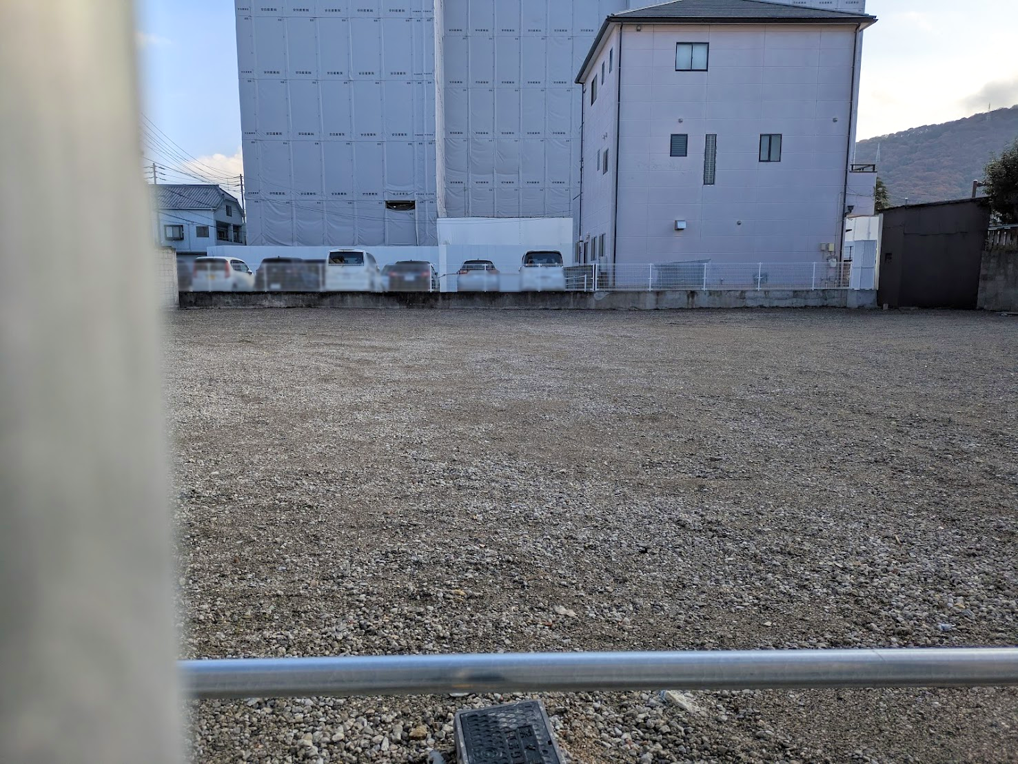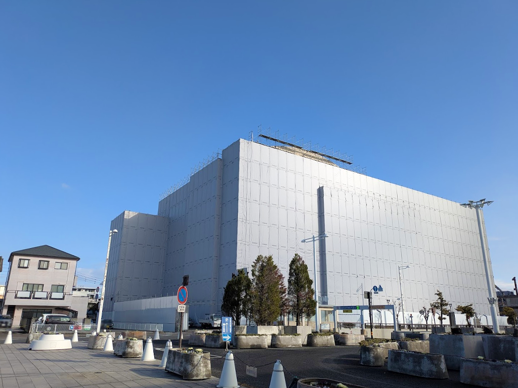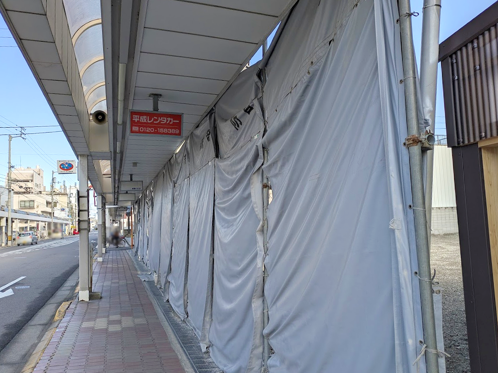 さて、更地になった場所のすぐお隣(東側)を見てみると、そこには坂出最大の解体現場「イオン坂出店」が鎮座しています。かれこれ1年以上解体工事が続いていますが、いまだに巨大な防音シートに覆われていて要塞状態。