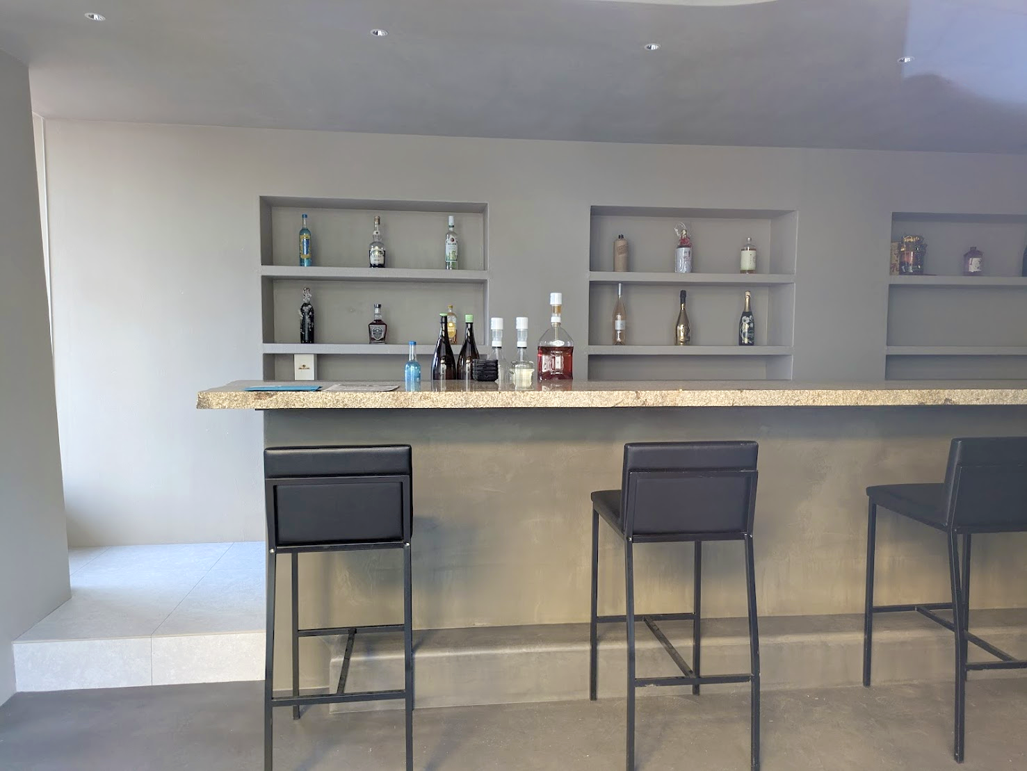 ガラス張りになってるので店内の様子が見えるんですけど、すでに内装もかなり仕上がってきているようです。 グレーで統一された壁面にはボトルがディスプレイされた棚があり、重厚感のあるカウンター席が並んでいます。