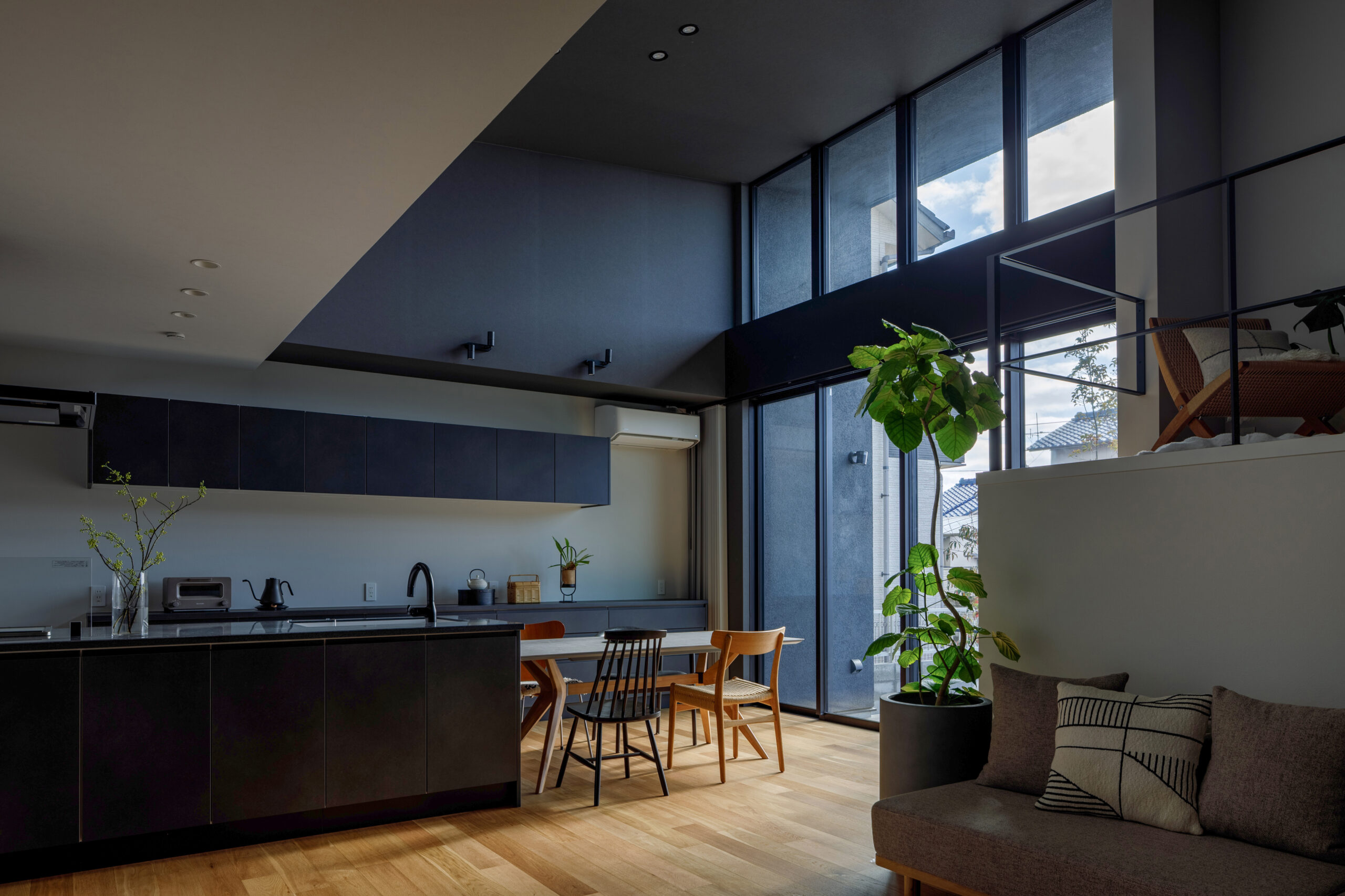 外壁にも、一般的なサイディングではなく、塗り壁やガルバリウム鋼板を使うことで、スタイリッシュさと高い耐久性を両立させています。