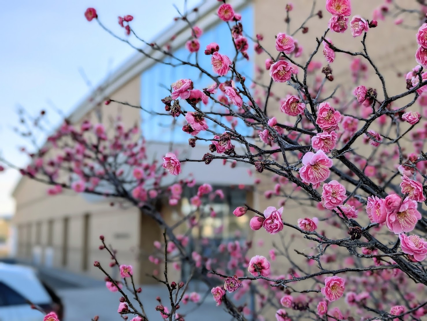 最後は「綾川町立図書館」へ。 入り口付近にある梅の木ですが、濃いピンクが可愛らしい紅梅の方はかなり見ごろに近づいています!
