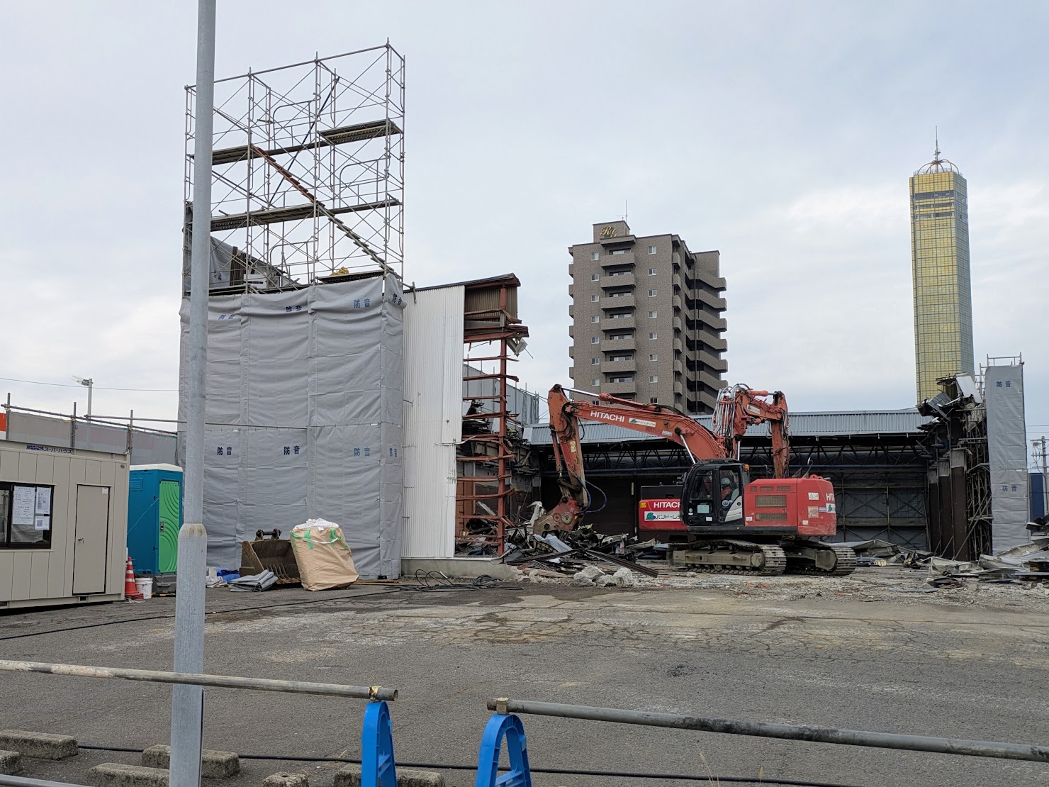 フェンスに掲示されている「建築物等の解体等作業に関するお知らせ」を見てみると作業期間は2026年4月2日(木)までになっていて、工事は2月4日(水)からスタートしていたようです! 看板の予定では4月上旬ごろまでとなっていますが、開始から約1週間のこの日に立ち寄ってみると建物の大部分はすでになくなっていました。
