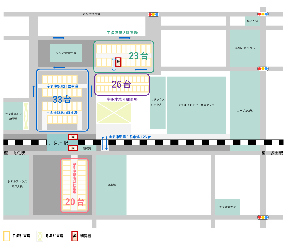 宇多津駅北口 33台 300円 20分以内無料