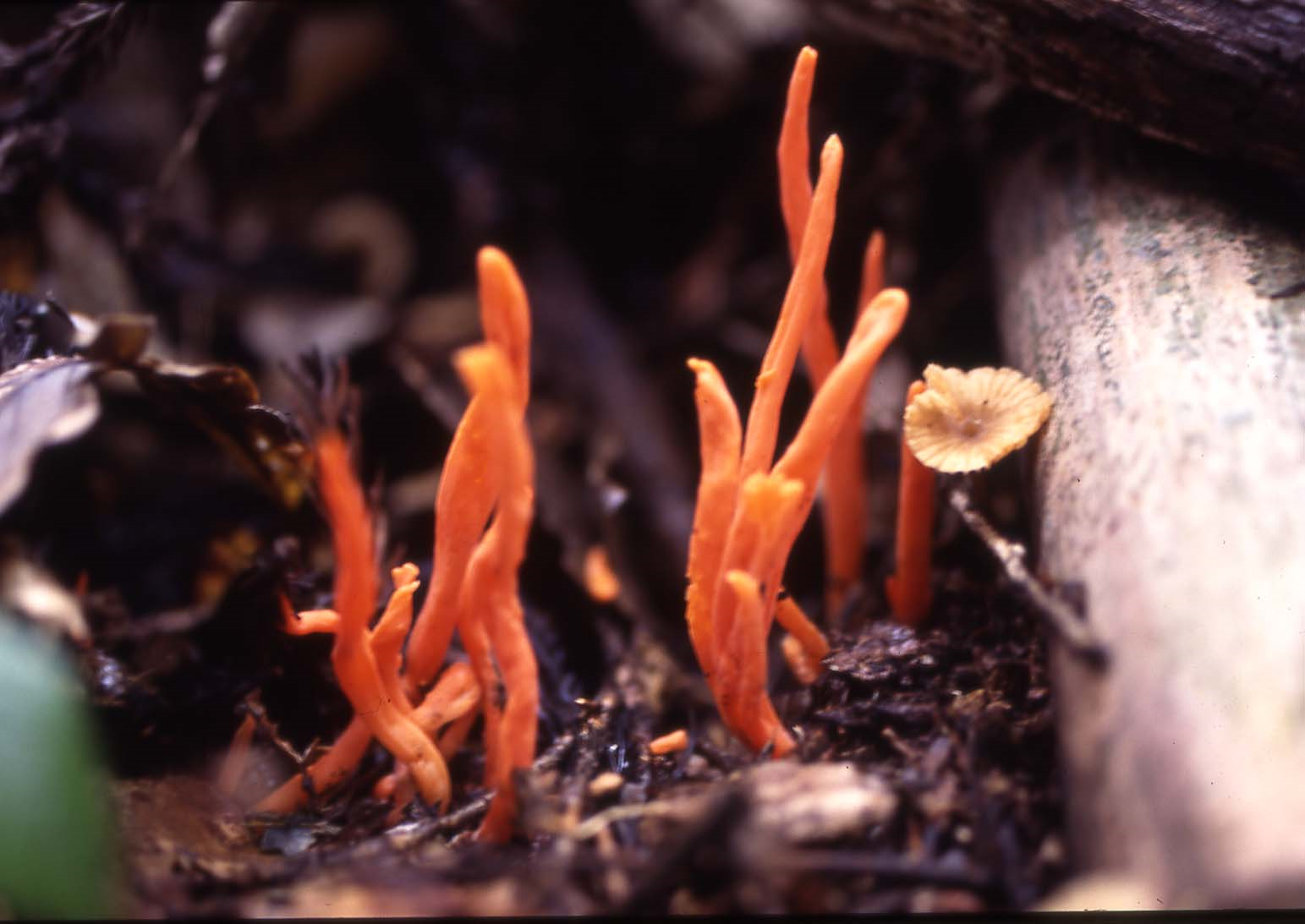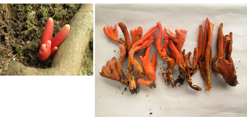 ベニナギナタタケ: カエンタケより細長く、触ると柔らかい。
