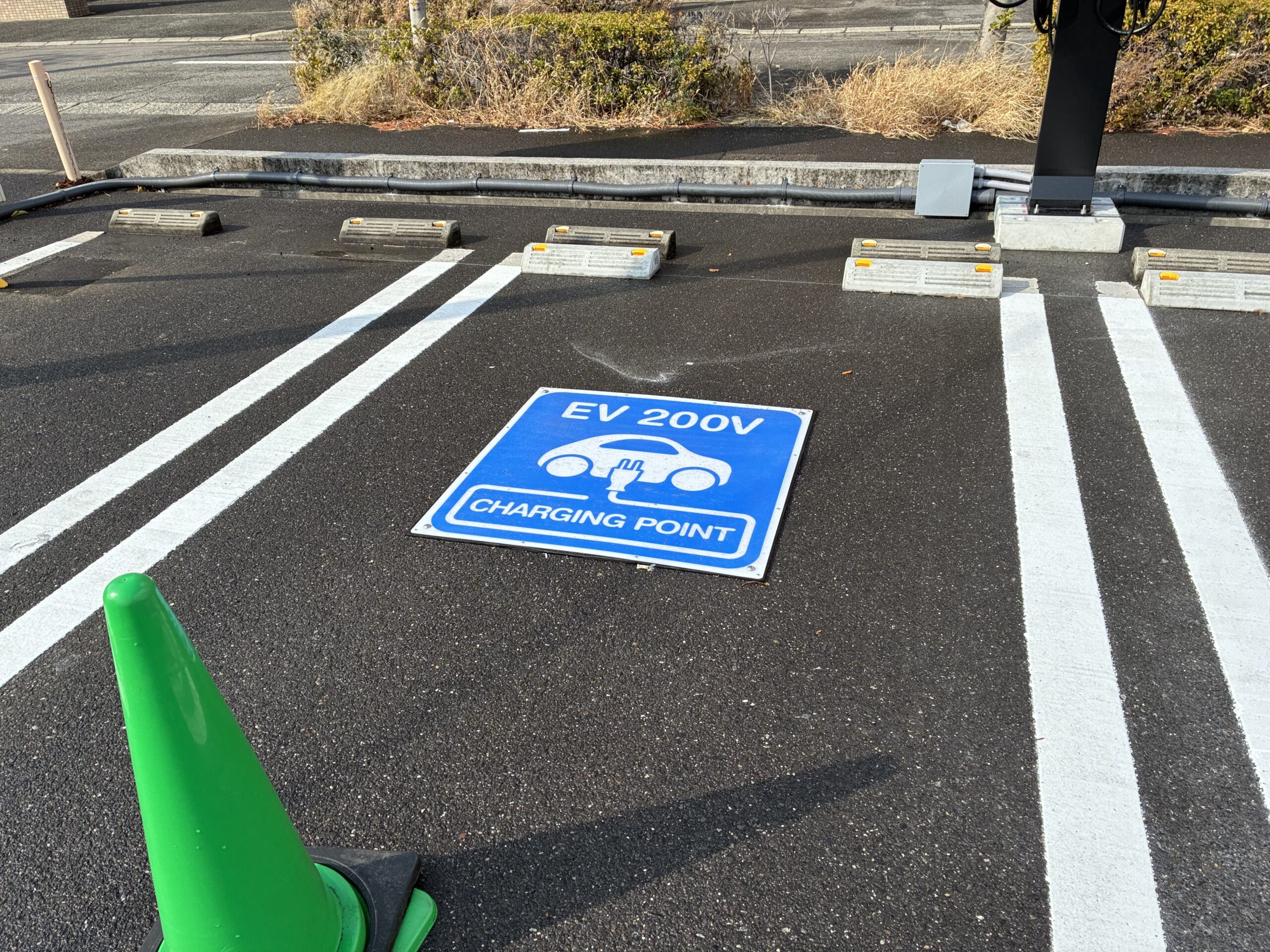 充電可能区画には「EV 200V CHARGING POINT」の掲示があります。
