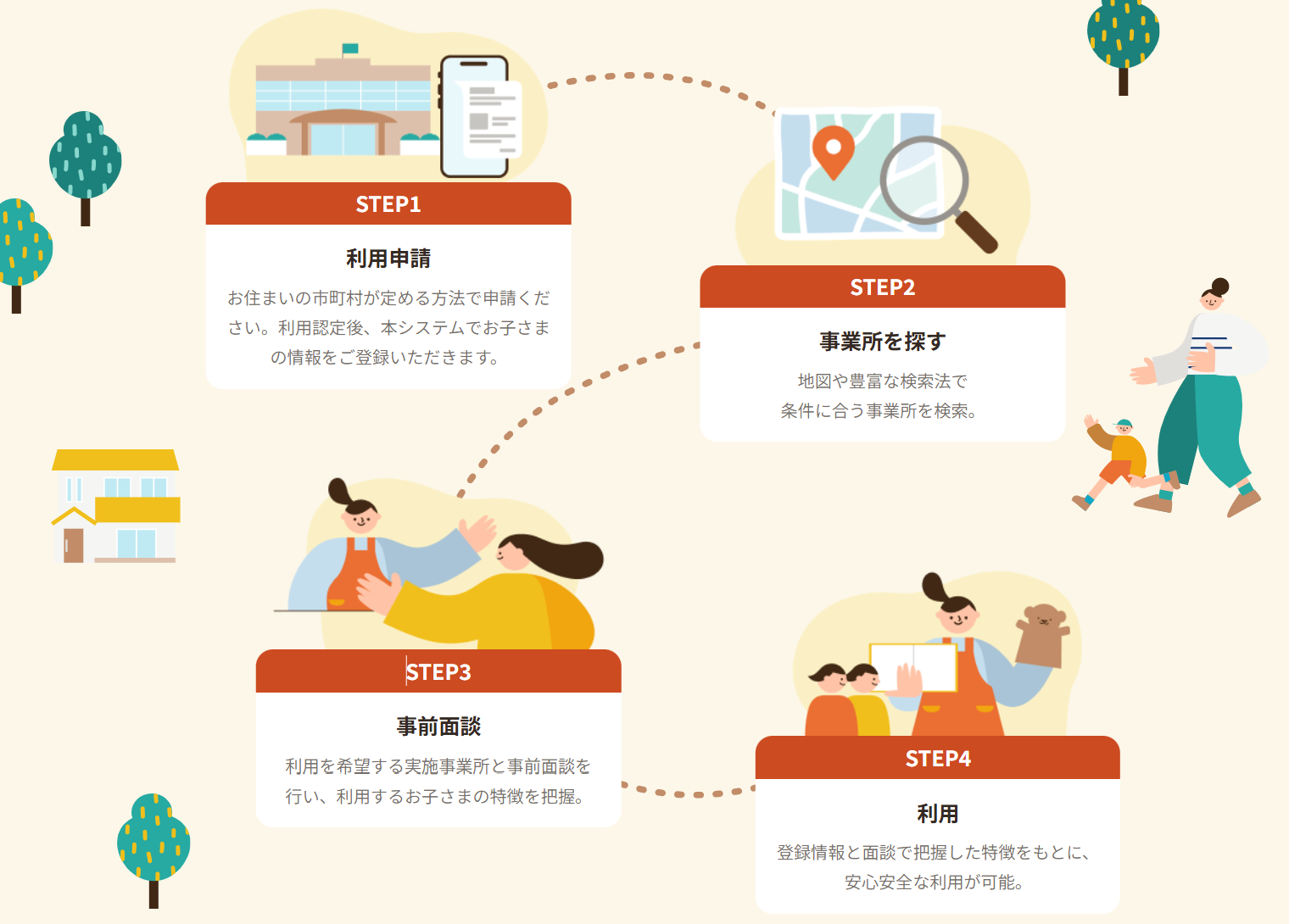 各市町で、スマホから認定申請や面談予約、利用予約ができる専用システム「つうえんポータル」が導入されています!