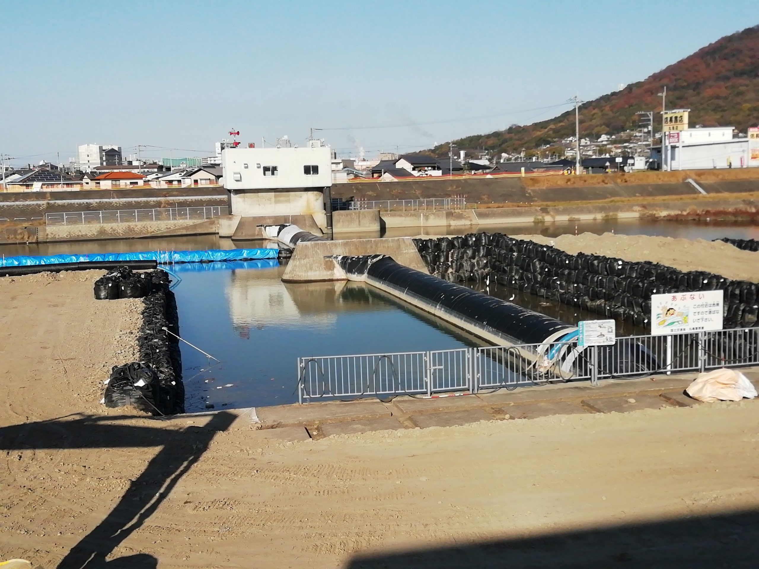 土器川下流域で大規模な工事をやってる。災害に備えて川の流れをまっすぐにする工事みたい