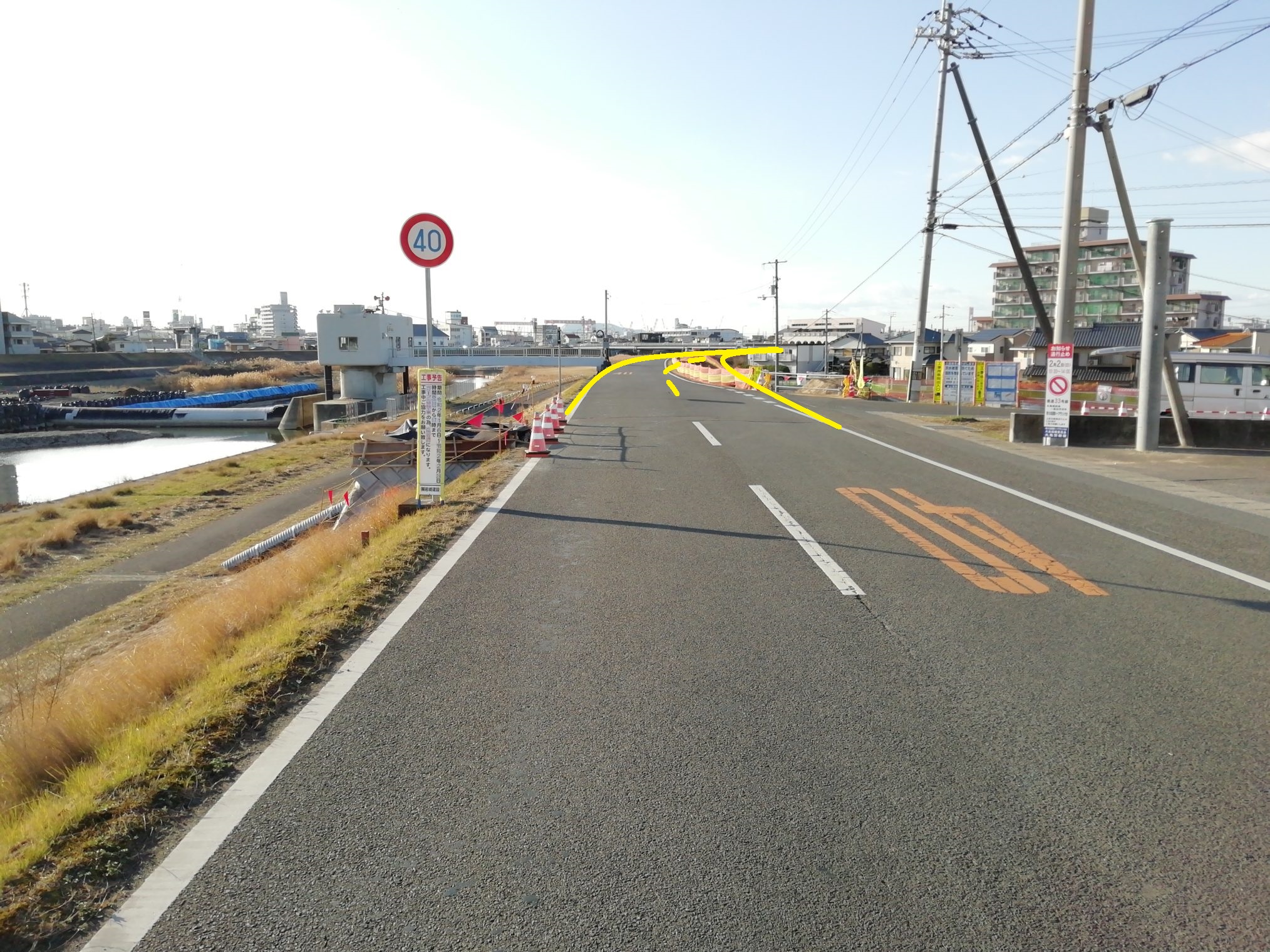 上の画像に手書きで車線を引いただけですが、イメージとしてはこんな感じです。車線を引いただけで、堤防自体はもう少し東寄りの、土手の下に土を盛っている場所あたりまで広がるそうですよ。
