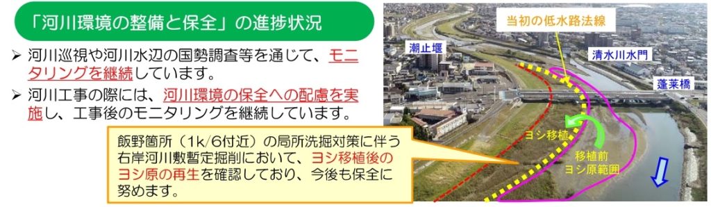 今回の掘削域には、もともとヨシ原がありましたが、環境保全のために掘削しない場所の移植を行ったそうです。