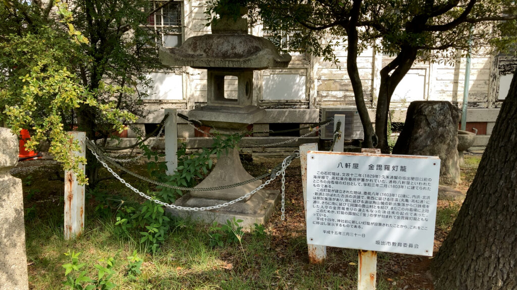 この石灯籠は、文政12年(1829) 久米通賢の坂出墾田以前の海岸線で、高松藩舟番所が置かれていた通称八軒屋と云われたところの舟着場の灯台 (高さ約2.90m) として、享和3年(1803) 癸亥2月に建てられたものです。この舟着場に上陸した人々の金毘羅参りの道ともなった諸往来の起点でした。このためか灯籠の露盤に『金』の字が刻まれて金毘羅灯籠となっています。