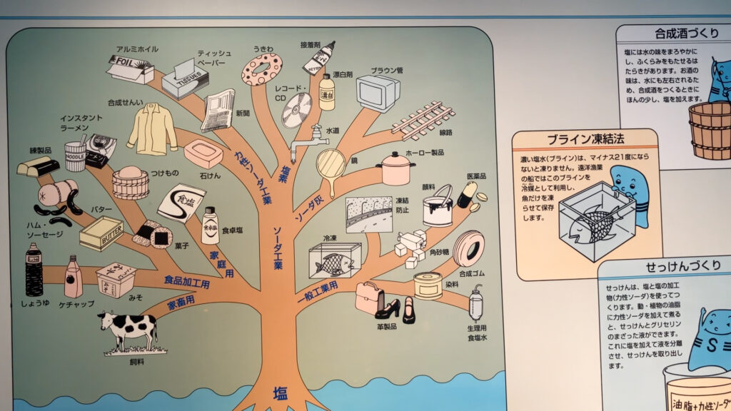 私たちの祖先が昔から塩の効用に着目し、様々な使い方でこの塩を活用してきたことについて展示しています。 現在の生産技術の進歩にともない、塩の利用範囲はますます広がっています。 こういった歴史の中で、塩と人の生活がいかに結びついているかを見ることができます。塩業に対して、過去から今、未来まで色々な角度で感じることができそうですね。