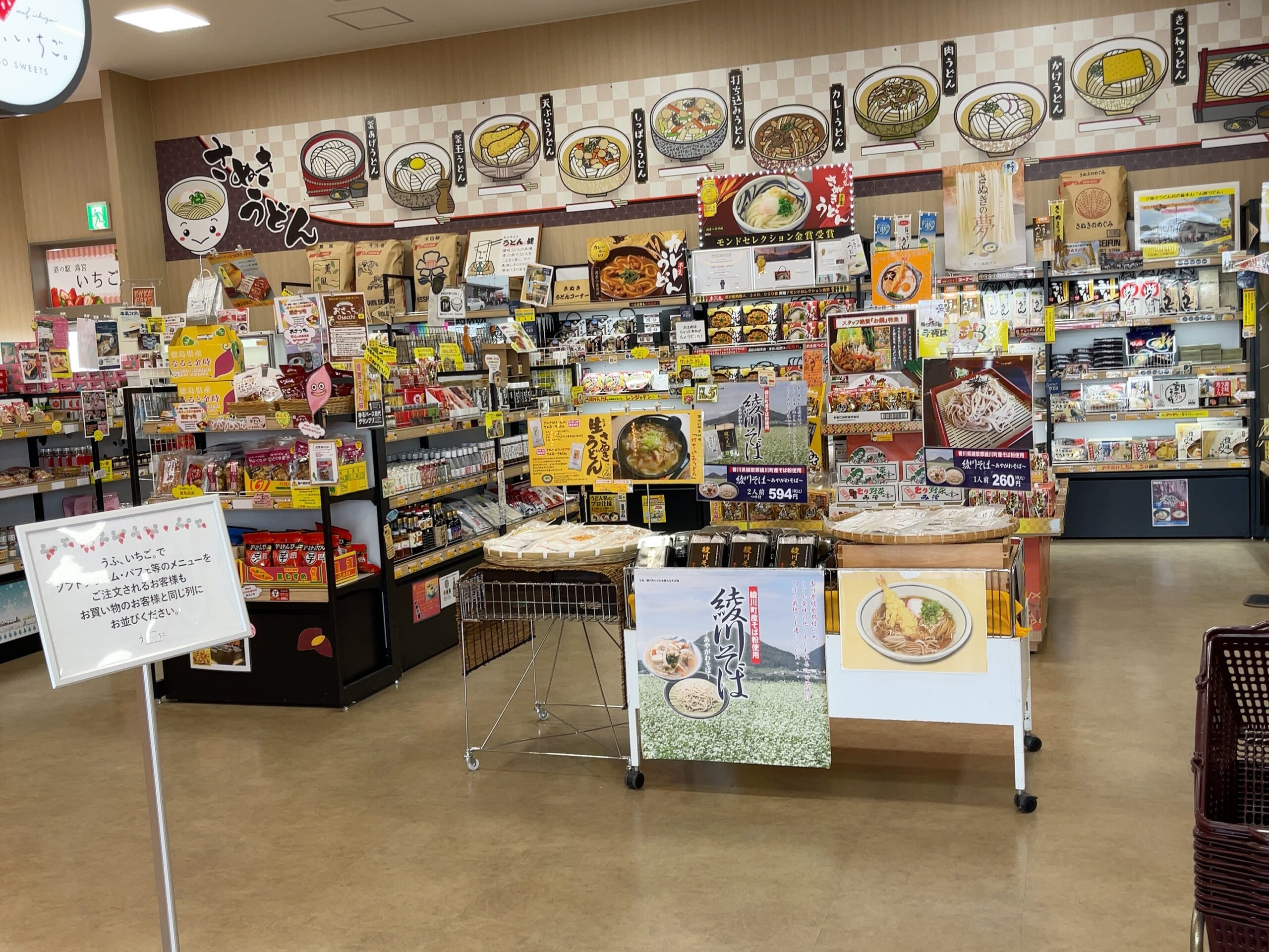 建物内に入ると正面にはお土産コーナーがあり、綾川町内はもちろん香川県内の様々なお土産が販売されています。「いちご農園」に行くには左奥へ進みます。