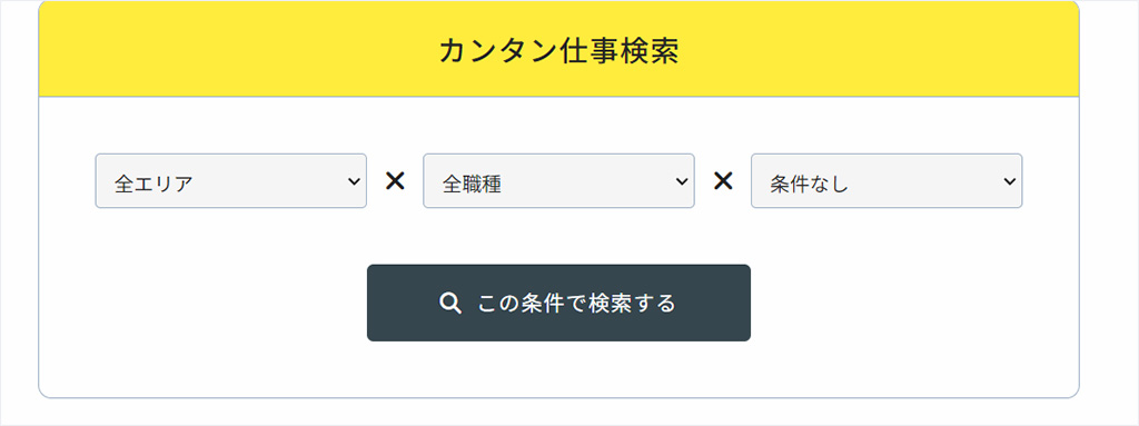1.サイトの一番上にある「カンタン仕事検索」でエリア、職種、条件を選択して「この条件で検索する」ボタンを押してください。