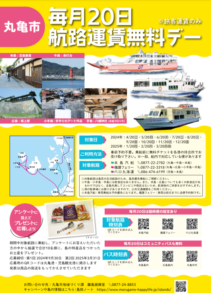 丸亀市で離島航路の旅客運賃が無料になる「離島航路運賃無料デー!」を2024年4月から毎月20日に実施するみたい!