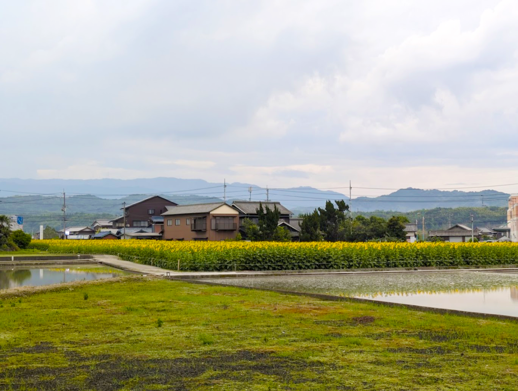 遠くからなのでわかりづらいですが、周辺の田んぼには山や空、ひまわりが写り込んでいてとっても綺麗です!スマホではこれが限界なので一眼レフがあれば・・・!と悔やんでしまいました(汗)