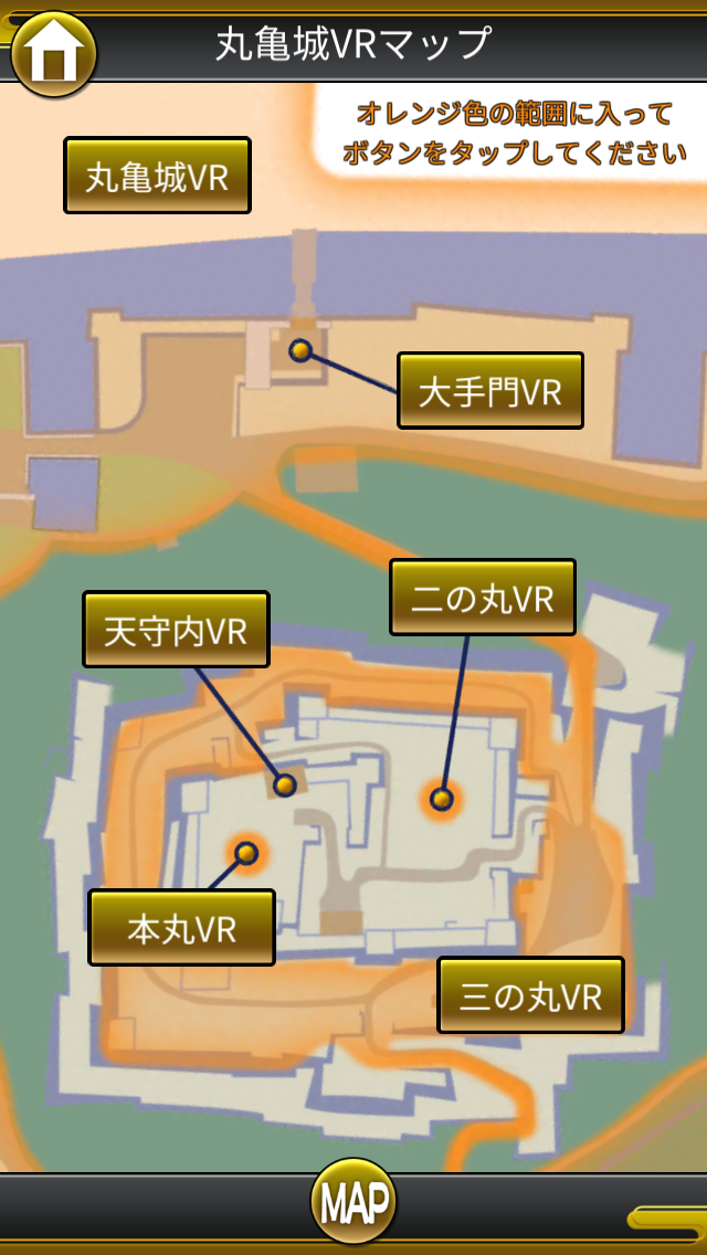 メニュー一番上の【丸亀城復元VR】をタップして、