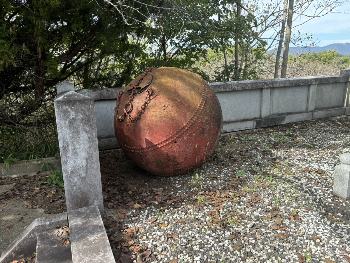 階段を下りて鳥居をくぐると「戦没者慰霊碑」が建っていました。中でも一際目についたのは敷地内の一角にあった直径1メートルほどの用途不明の鉄球です!野球のボールのような縫い目も見えますが、これを投げるには身長が20メートルくらい必要ですよ。まさか山姥が使用していたボールなのか!? 身長20メートルの山姥はここにはいなさそうなので元来た道を引き返してもう1本の道に向かいます。