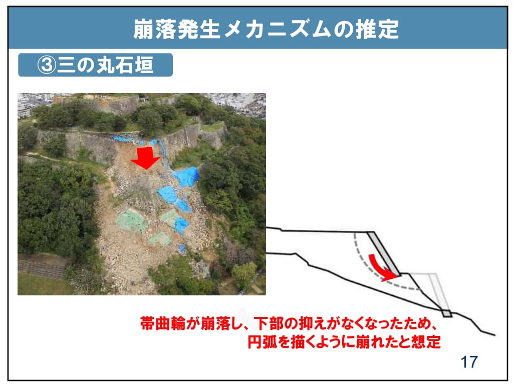 現在ある計測データや写真を元に、現時点で推定される崩落発生メカニズムについては、最初に崩落した帯曲輪南面は、崩落後の写真で表面に石垣が見える事から、すべり破壊(いわゆる、円弧すべり)を起こしたと考えられます。